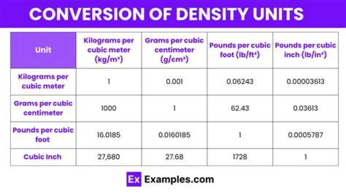 - kg/m³ (kilogram per cubic meter): Satuan untuk massa jenis dalam sistem metrik (SI). Satu kilogram massa per meter kubik volume.