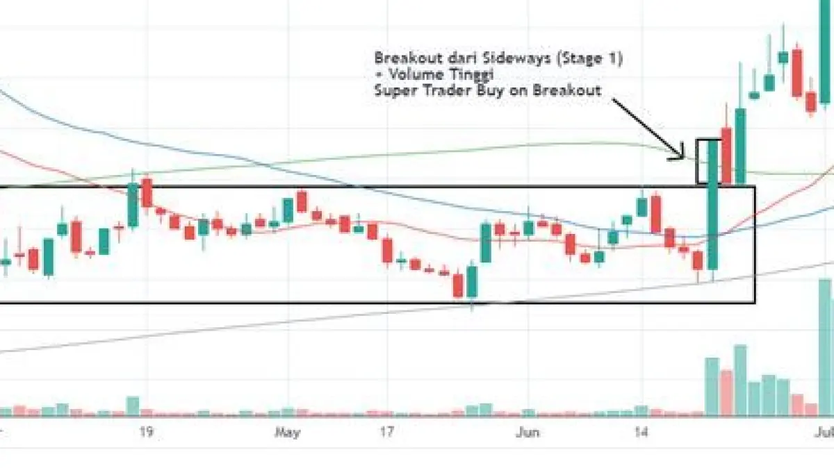 Breakout terjadi ketika harga saham bergerak di atas level resistance atau di bawah level support (batas bawah) dengan volume perdagangan yang signifikan. Ini menunjukkan adanya perubahan sentimen pasar dan potensi tren baru.
