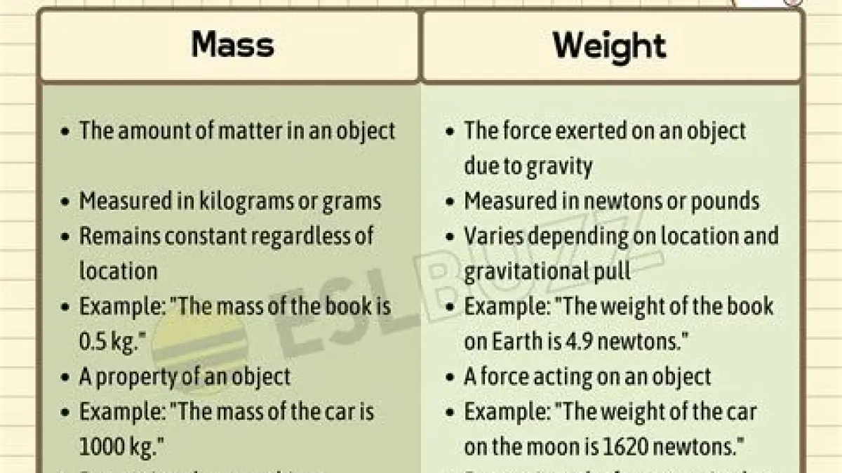 Perbedaan Utama Massa dan Berat dalam Tabel:
